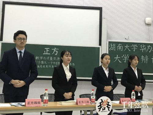12月18日晚7:00,湖南大学“华为杯”2017大学生校园辩论赛第三轮在研究生院楼C302教室举行,本次辩论赛双方为正方数学与计量经济学院,反方南校区工商管理学院,双方以“进一步强化‘一个中国’意识,增强香港归属感更需要依靠官方力量还是非官方力量”为辩题展开了一场精彩的辩论。最终反方三辩获得本场比赛的最佳辩手,数学院获得本场比赛的胜利,进入四强。
