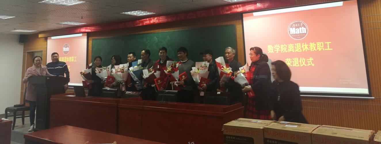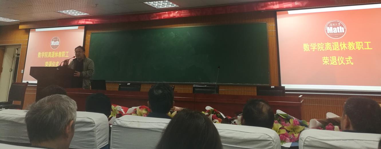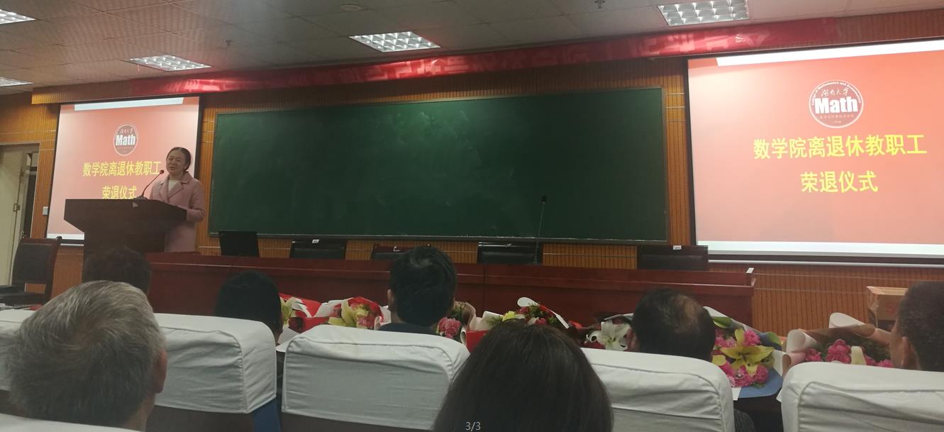 接下来欢送会进入高潮,八位退休教师上台,蒋月评院长和程卓蕾书记为每一位老师颁发了“光荣退休”的荣誉证书。年轻教师上台献花,这一幕意味着传承,数学院的接力棒也将逐步传递给年轻教师。献花结束后,胡跃荣老师作为退休教师代表上台,感谢学院领导和同事的关心。他说自己已经在湖大工作了一辈子,对湖南大学、对数学院有着深厚的情怀,自己一定把退休的生活过好,学院只要有需要他会随时出现。