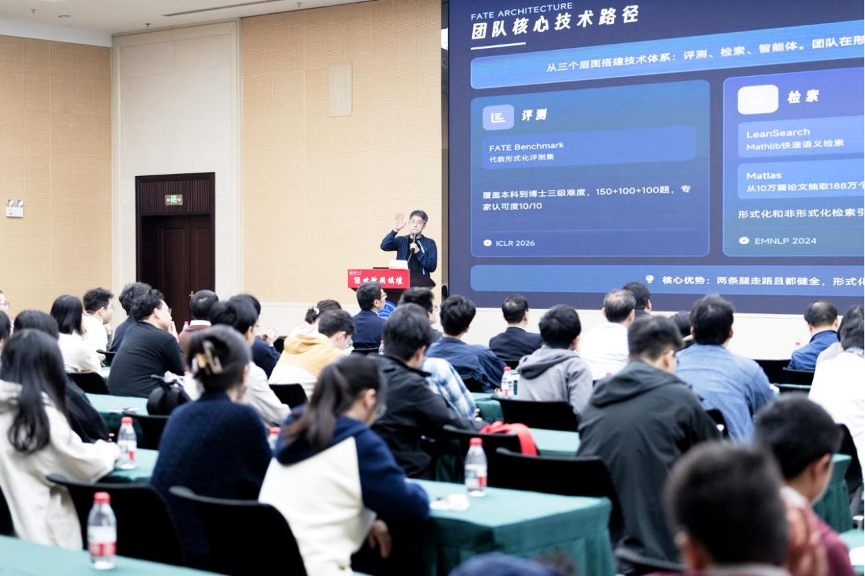 刘若川深入解析了数学与人工智能研究的交融历程及其变革影响。他以时间脉络为线索,从早期计算工具与定理验证系统的应用,到神经网络阶段的探索实践,再到当前大模型驱动下迎来爆发式发展,系统梳理了数学与人工智能的互动演进脉络,向在场师生全面展现了这一交叉学科领域的发展进程。结合“深度学习辅助数学猜想与探索”“推进形式化证明发展”等自身及团队正在开展的前沿研究方向,刘若川进一步分享了对未来数学家与人工智能协同工作模式的思考与展望。